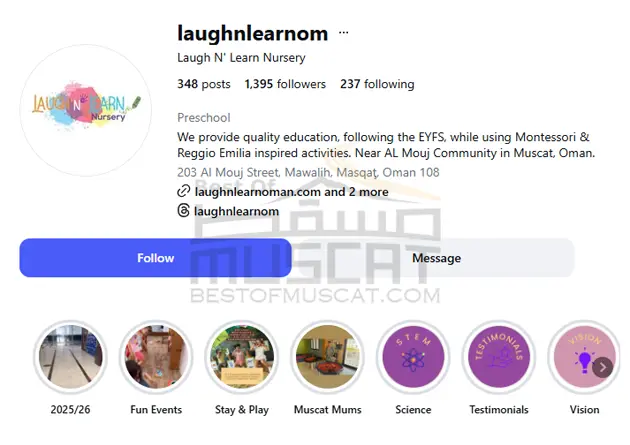 Laugh N Learn Oman in Al Hail offers a fun and engaging early learning environment designed to support children’s creativity and development. With a focus on interactive activities, play-based learning, and a caring team, it’s a great choice for parents looking for a balanced and supportive preschool experience in Muscat.